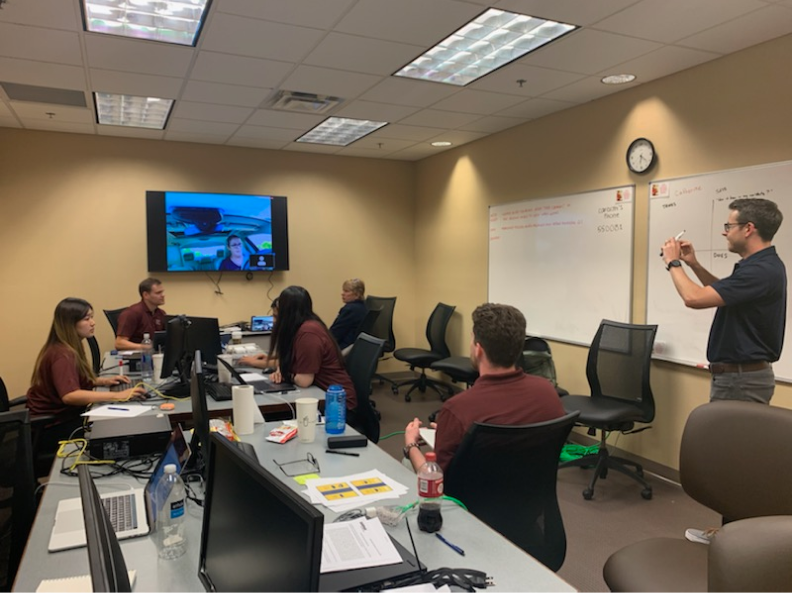 Through lots of trial and error we learned the easiest and quickest way to test our conversational agent was to "Wizard of Oz" our tests. Our prototype involved multiple moving parts: including the actual conversational agent voice, the accurate data that is used to answer questions, and the visual interface in the car. Each of these parts required one team member to help create the overall experience for each of our test drive participants. We ended up with a complicated set up of multiple phones and Zoom calls to capture audio, video, and location so we could interact with the participant. We had to be scrappy at times, like when we realized sharing Google maps interfered with the Zoom audio, so we had to put an extra phone in the glove box as our makeshift GPS.